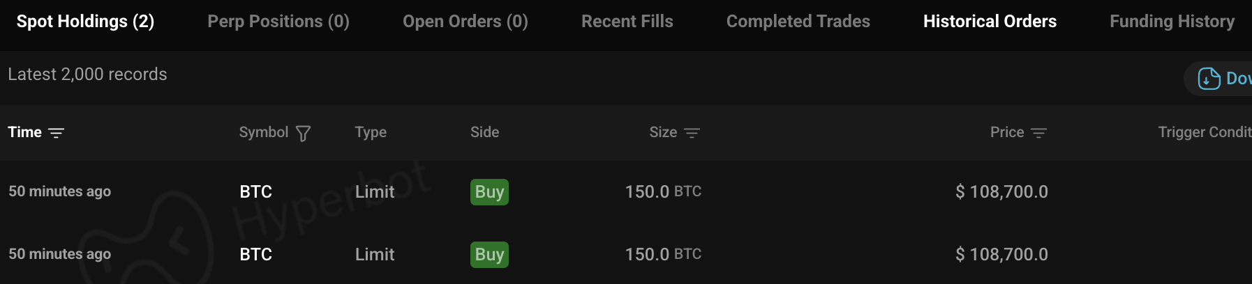 Odaily星球日报讯 Hyperbot 数据显示,“10.11 至今胜率 100%巨鲸”已取消在 Hyperliquid 挂单的 1630 万美元 BTC 多单。