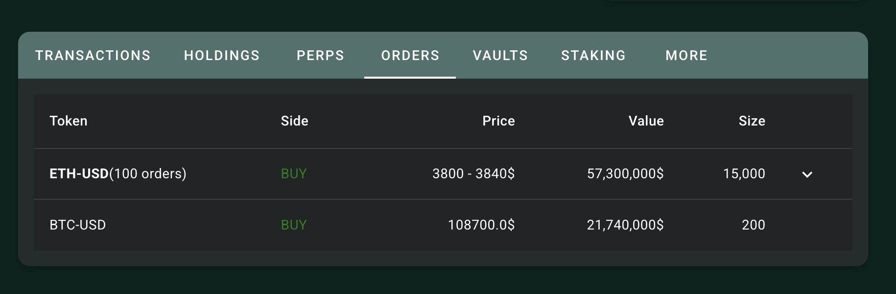 Odaily星球日报讯 hypurrscan 数据显示,“10.11 至今胜率 100%巨鲸”在 Hyperliquid 上挂单 ETH 和 BTC 多单,分别为: