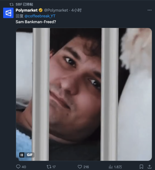 Odaily星球日报讯 SBF 的 X 账号转发了 Polymarket 的一条回复内容,该回复内容为“Sam Bankman-Freed?”(Sam Bankman 被释放了吗)。