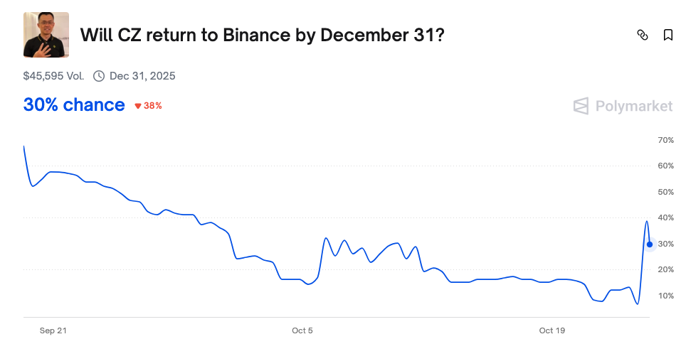 Polymarket上“CZ在12月31日前回归币安”概率升至30%
