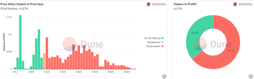 根据Dune Analytics 2 月 2 号的数据(ETH 价格 1600 美元左右),在质押的 ETH 中,有 35.5 %ETH 处于盈利状态,而有 64.5 %处于亏损状态。从这个角度来看,质押的 ETH 被主动撤出的动机也不会太强。