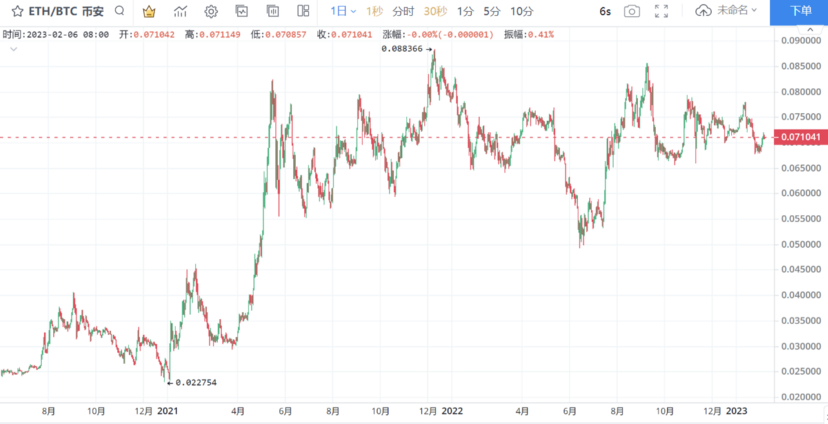 实际上,从 2021 年下半年开始,ETH/BTC交易对就进入了横向运行阶段。在这个区间内,ETH 市值约占 BTC 市值的一半,这似乎成为了当前市场认可的某种价值平衡。要打破这种平衡,需要外力或新叙事的推动。例如,以太坊链上活动激增导致 ETH 通缩加剧,或者 ETH 得到更多的传统金融的推崇。但是目前还没出现上述迹象,这也使 BTC 和 ETH 两者之间的相对估值变得困难。