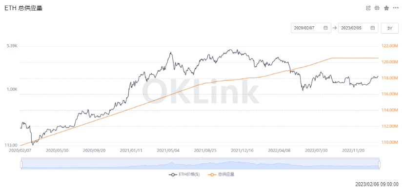 ETH 总供应量从 2022 年 9 月份开始走平,并且有减少的趋势。