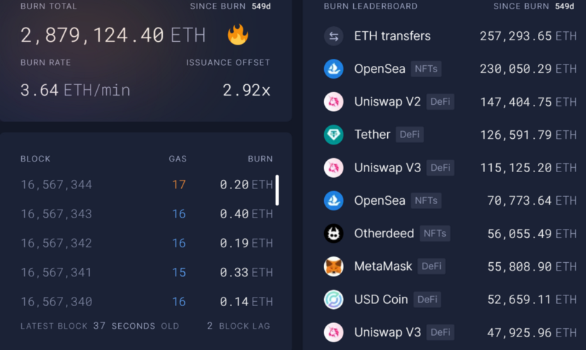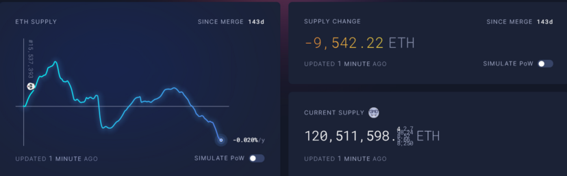 (图)ETH当前的年通货膨胀率为-0.02% ,自合并以来总供应量减少了 9500 多枚