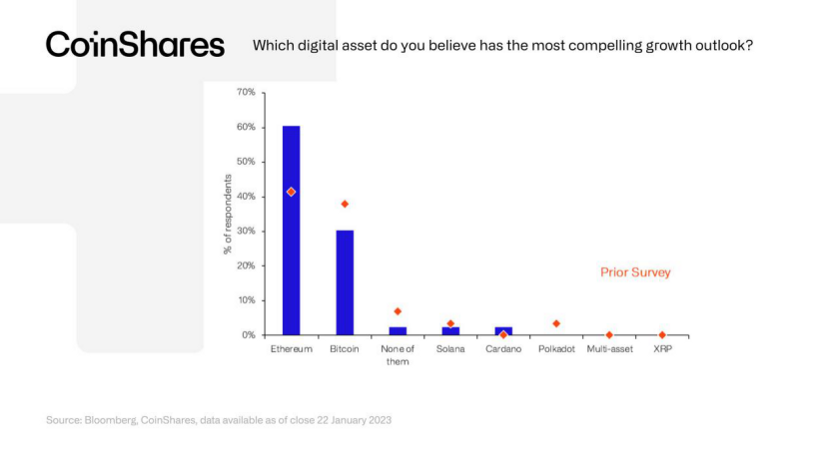 【注:】最近,被称为“欧洲最大的数字资产投资和交易集团”的 Coinshares 发布一项调查,以深入了解数字资产领域专业投资者的思想和行动。根据 Coinshares 最新的数字资产季度基金经理调查的结果,在接受调查的 43 个基金经理中(资产总额为 3900 亿美元),有 60 %的基金经理认为 ETH 在 2023 年增长前景最好。该调查还发现,对 BTC 和 ETH 的投资得到了巩固,并且越来越多地被包括在对冲基金投资组合中,从 0.7 %上升到 1.1 %,将数字资产包括在投资组合中的趋势是由客户需求和投机所驱动的。