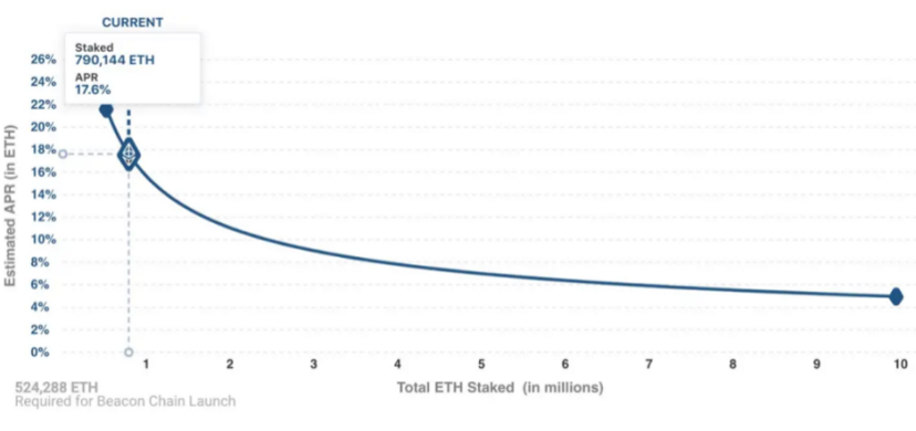 换个角度看,上海升级一旦成功,以太坊主网上质押的 ETH 可以灵活退出(排队时间不会太长)。实际上,ETH 质押利率是一个动态博弈的过程,当质押的 ETH 数量较少时,质押回报率非常高,从官方公布的 ETH 质押 APR 图中看到,当质押总量为 79 万个时,APR 可以达到 17.6% 。但是,当高 APR 吸引大量的 ETH 质押时,APR 会慢慢下降,当 ETH 质押量达到 1000 万个时,APR 将下降到 5% 左右,也就是目前的水平。不过,随着 ETH 质押量的增加,APR 下降曲线也会更加平缓。