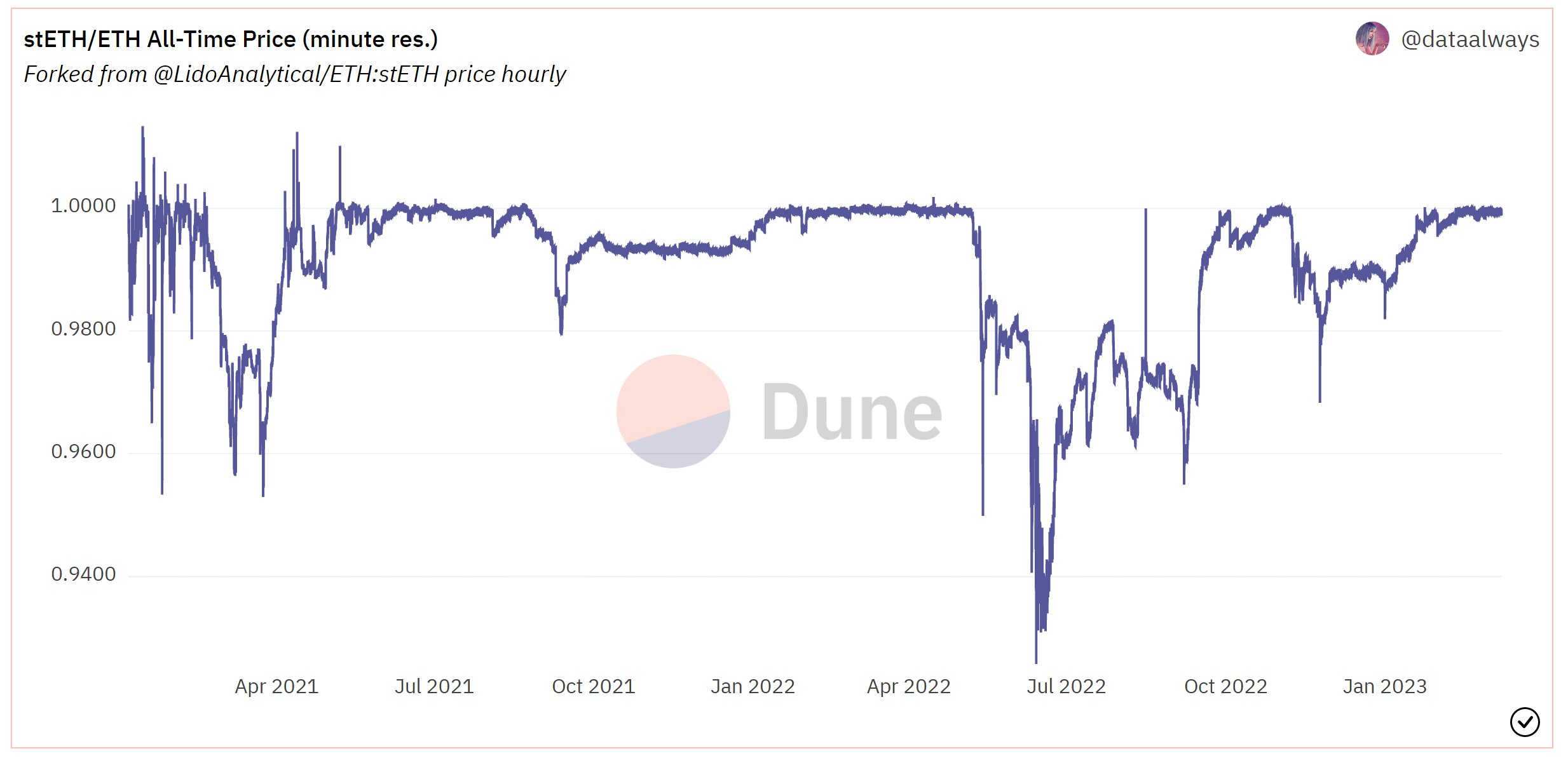 LST 代币已经占总抵押量的 65% 左右。而这些抵押衍生代币,在过去两年的时间内,出现过大幅度的折价。目前,由于上海升级的临近,LST 整体流动性较好。提款开放对 LST 价格回归是一个利好,但同时也很考验各个 LSD 项目方的风险管理能力和提款流程设计。