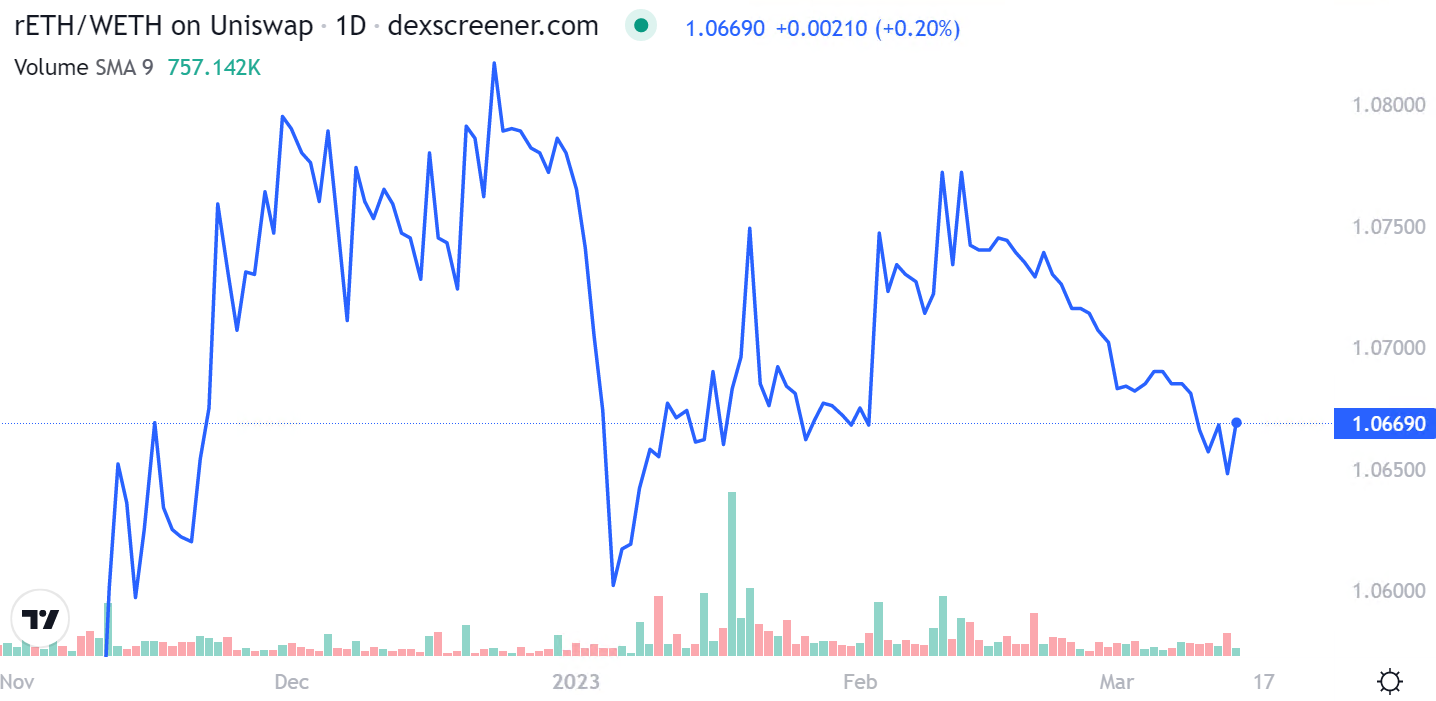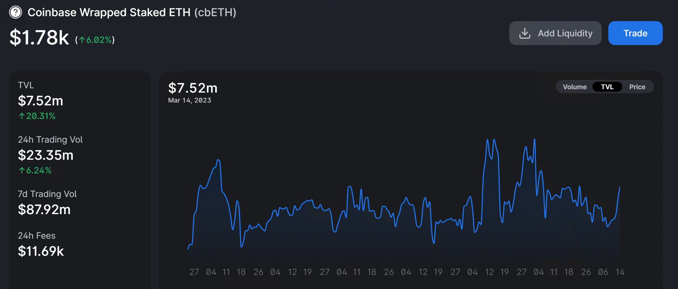 Coinbase的 LST 代币 cbETH 之前一直是折价的状态,cbETH 主要在Uniswap中,目前大约 TVL 为$ 7.5 M,每日交易量较低,可能会出现流动性不足的情况。但最近表现强势。可能随着上海升级的临近,套利者可以通过购买折扣价的 cbETH 获利。