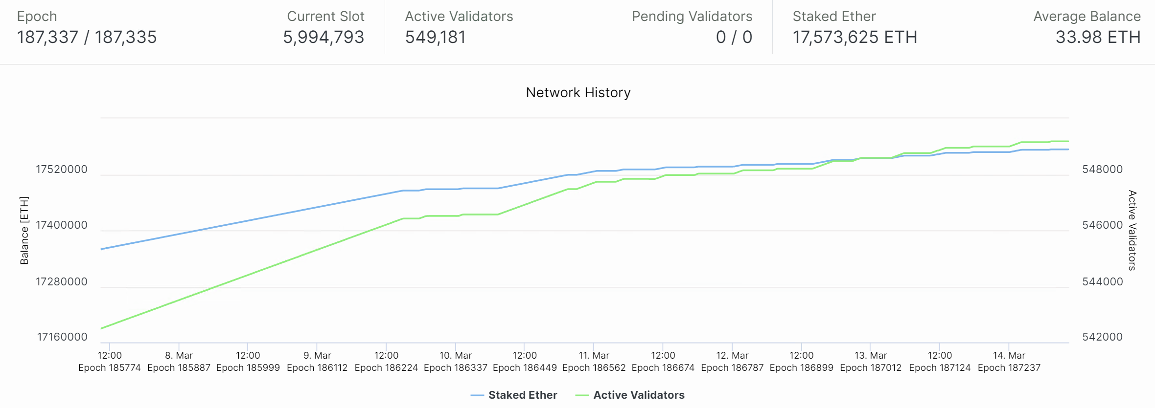 根据 Beaconcha.in 的数据,截止 3 月 14 日,Beacon 链上已质押 17, 573, 625 ETH。活跃验证者数量为 549, 181 ,当前每个验证者平均质押的 ETH 为 33.98 个,Beacon 链上 ETH 总数为 18, 661, 170.4 ETH。
