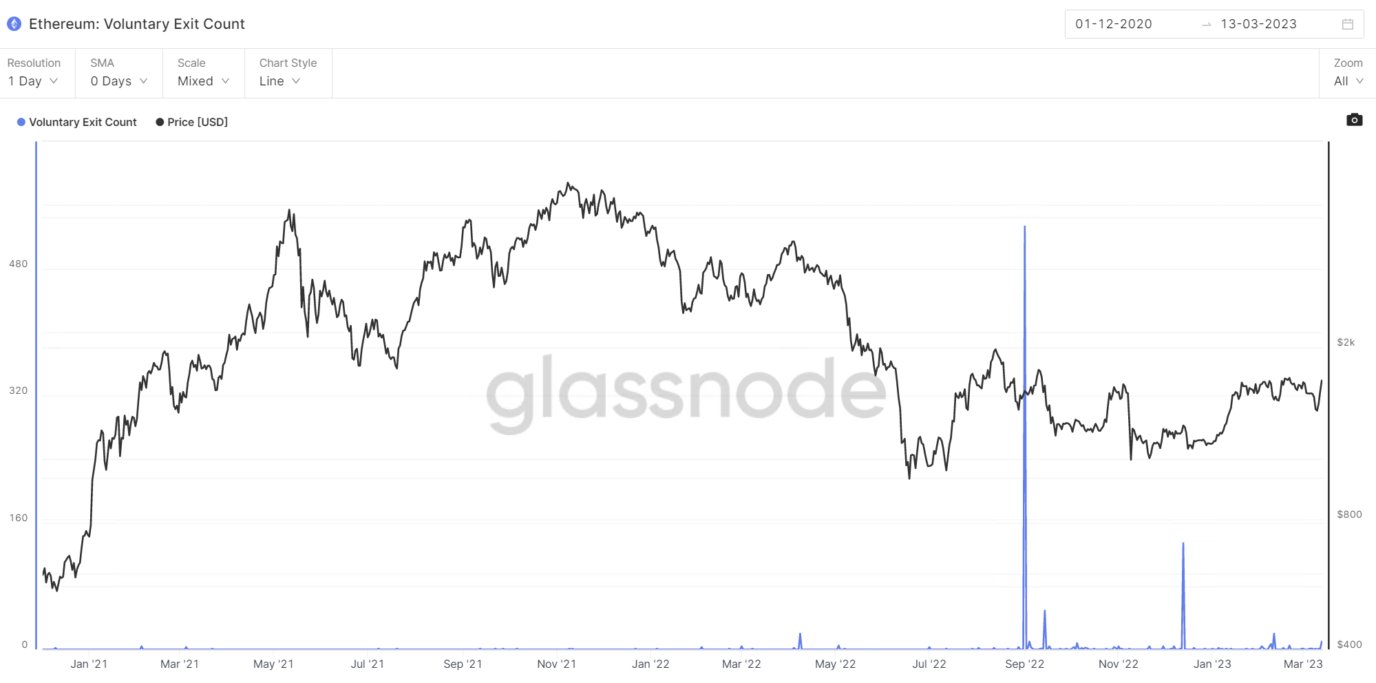 图 3. 自愿退出验证者节点的数量统计(来源:glassnode)