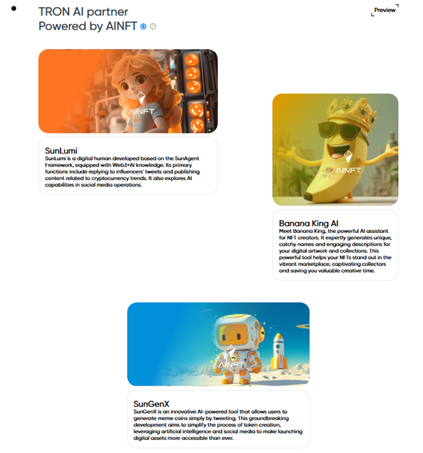 目前,AINFT 已初步完成对波场 TRON 生态内多个 AI 创新项目的整合工作,生态轮廓愈发清晰,实用性也逐步凸显: