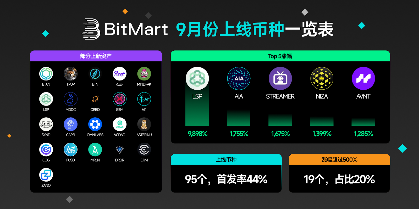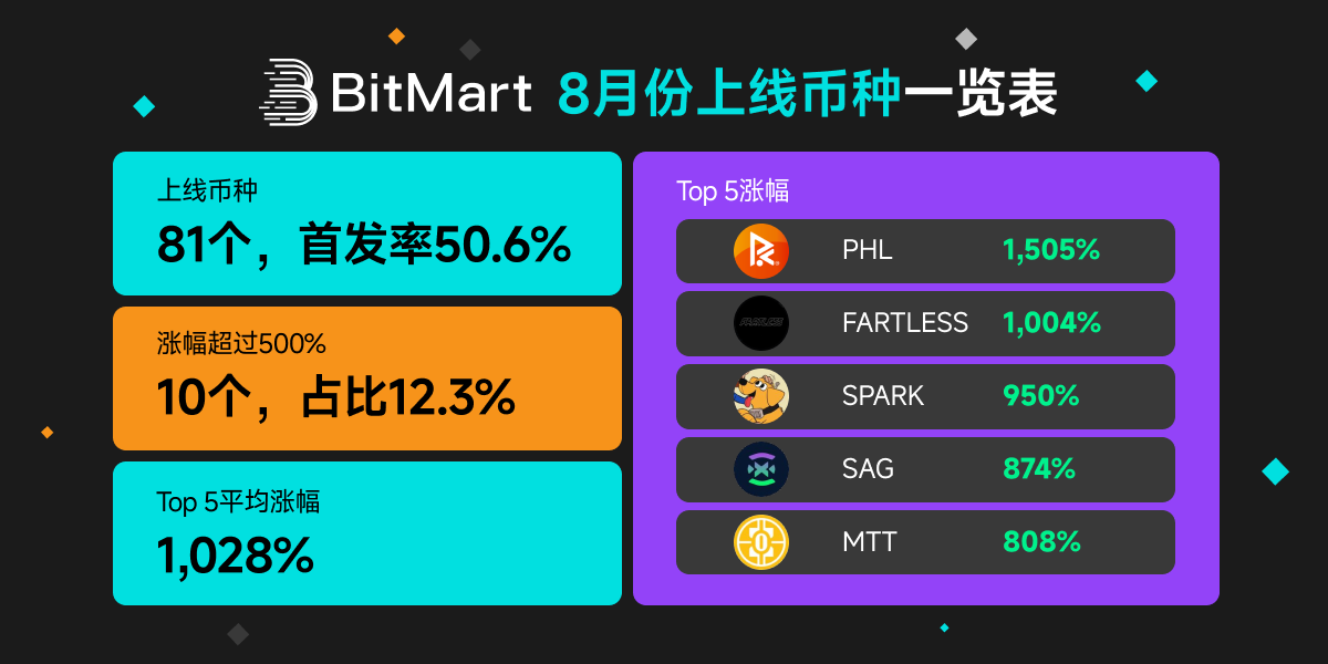 在情绪反复的加密市场,交易所的“上币速度”和“资产质量”往往是最直观的行业晴雨表。2025 年第三季度刚刚收官,BitMart 公布的 9 月上币数据再次成为行业关注焦点:平台当月共上线 95 个新币,首发率达 44%,涨幅超过 500% 的资产多达 19 个,多个项目在短期内实现数倍增长。