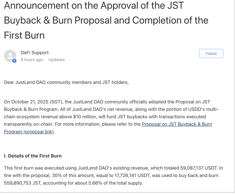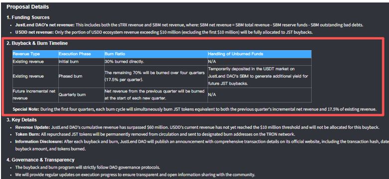 根据此前提案公告,JustLend DAO平台累计现有存量收益约6000万美元,这笔资金将全额分批注入JST 回购销毁;而USDD 生态需待盈利突破 1000 万美元门槛后,其增量收益才会加入回购销毁队列,为长期通缩储备额外动力。