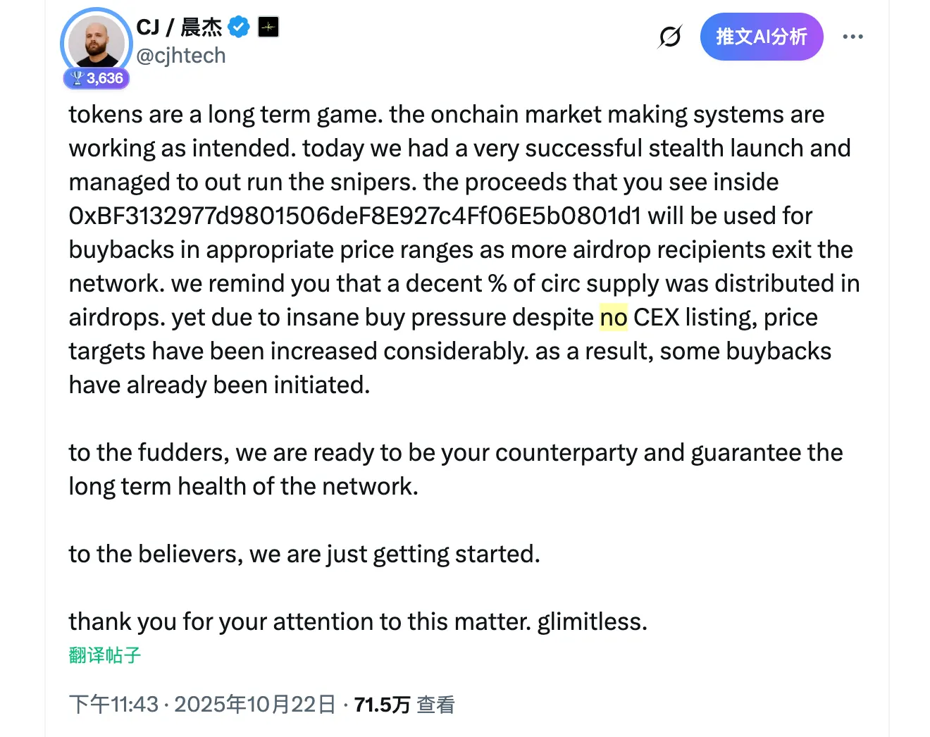 CJ 解释称,市场看到的资金流动来自团队的回购计划,尤其是在空投领取者抛售阶段;并强调,项目尚未登陆中心化交易所,但买盘强劲、价格目标已被上调。