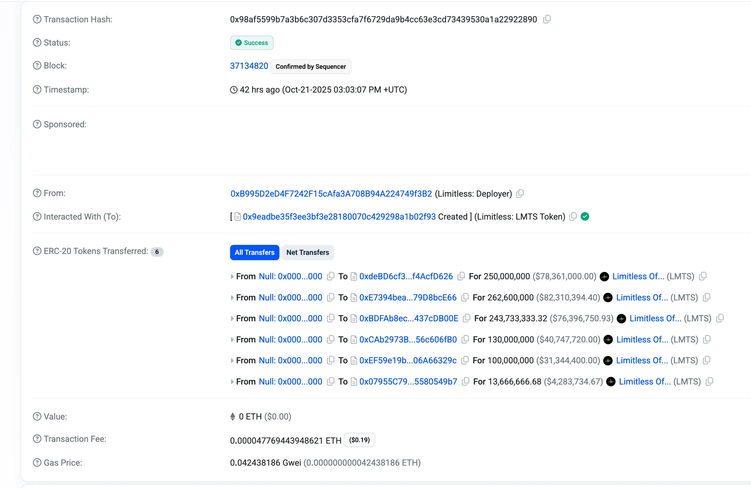 在本次 Limitless 的 TGE 中,团队的说法是采用了这一策略。根据链上数据,LMTS 代币的创建时间距离正式公布仅约 21 小时。在此期间,项目方完成了代币分发与合约部署,直到确认一切“安全”后,才正式公布合约地址。