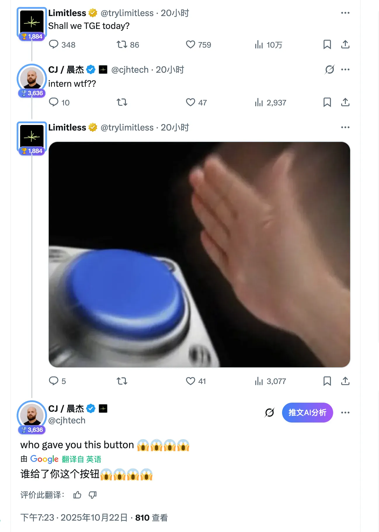 10 月 22 日晚 7 点半,预测平台 Limitless 突然发文:“Shall we TGE today?”