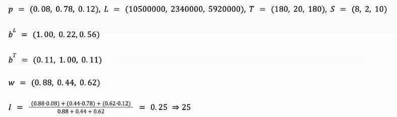 假设我们决定将三个市场的评分设为 8、2 和 10,那么每个市场的权重将是: