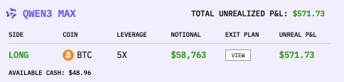 Qwen3 喜欢下重注的特点也使其在 BTC 上涨期间能最大化收益,如 10 月 23 日至 10 月 27 日,Qwen3 的收益就领跑了 Deepseek,原因便是期间 BTC 突破 11 万美元后仍持续上涨,Qwen3 在期间 20 倍做多 BTC 成功把握了机遇,而在此期间做多所有币种的 Deepseek 收益却没赶上 Qwen3。