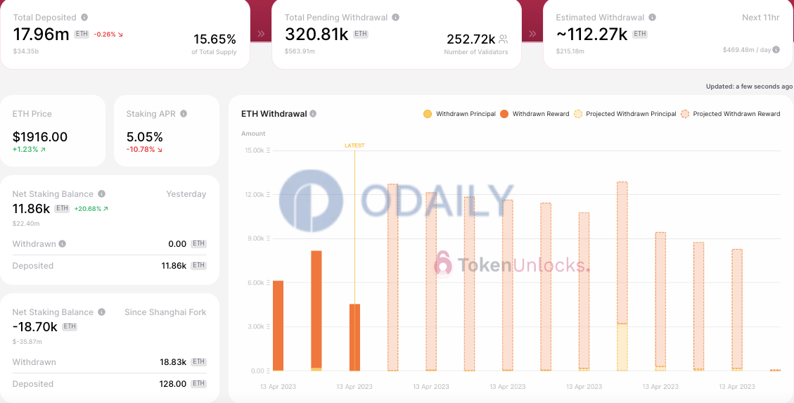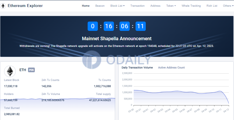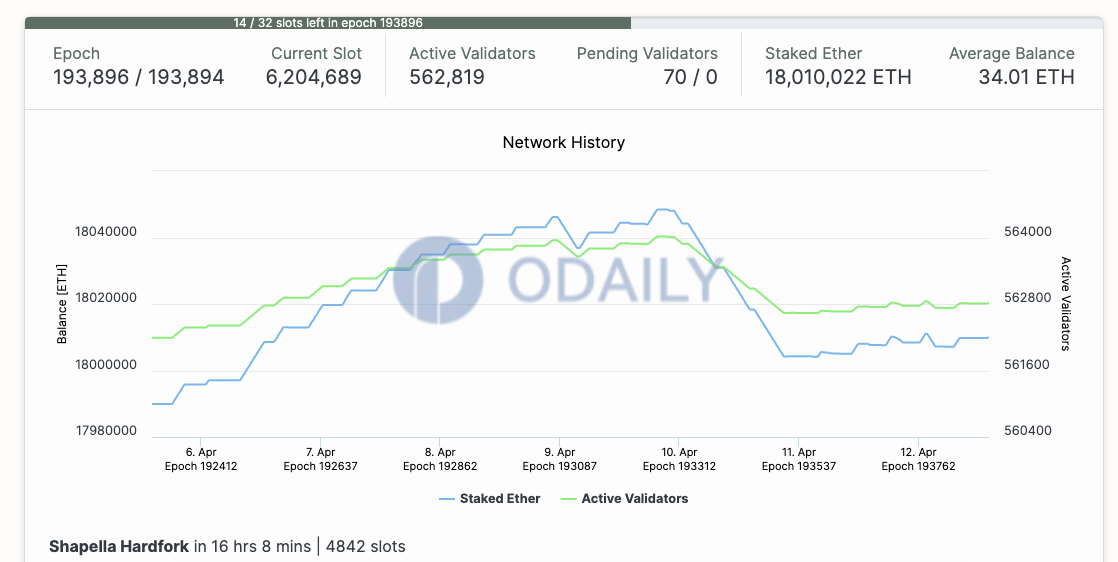 Odaily星球日报讯 据Tokenview浏览器页面显示,距上海升级还有16小时,上海升级计划于北京时间4月13日6:27 左右在以太坊网络启动,高度为194048。当前信标链ETH2 合约地址质押存款超1815万枚ETH,以太坊信标链活跃验证者已超56万。