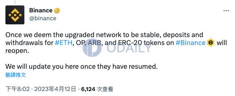 币安:将在以太坊完成上海升级且网络稳定后重新开放相关代币的充提服务