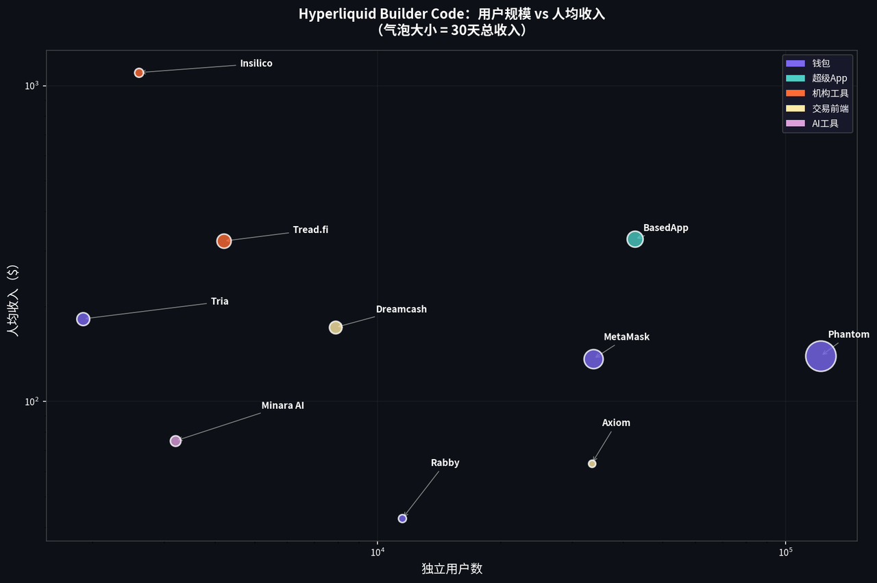 Insilico charges an extremely low 0.010% Builder Code fee, but $1.48B in trading volume generated $147.9K in revenue. Per capita revenue contribution is as high as $1,100, among the highest of all Builders, indicating its users are ultra-high-frequency traders.