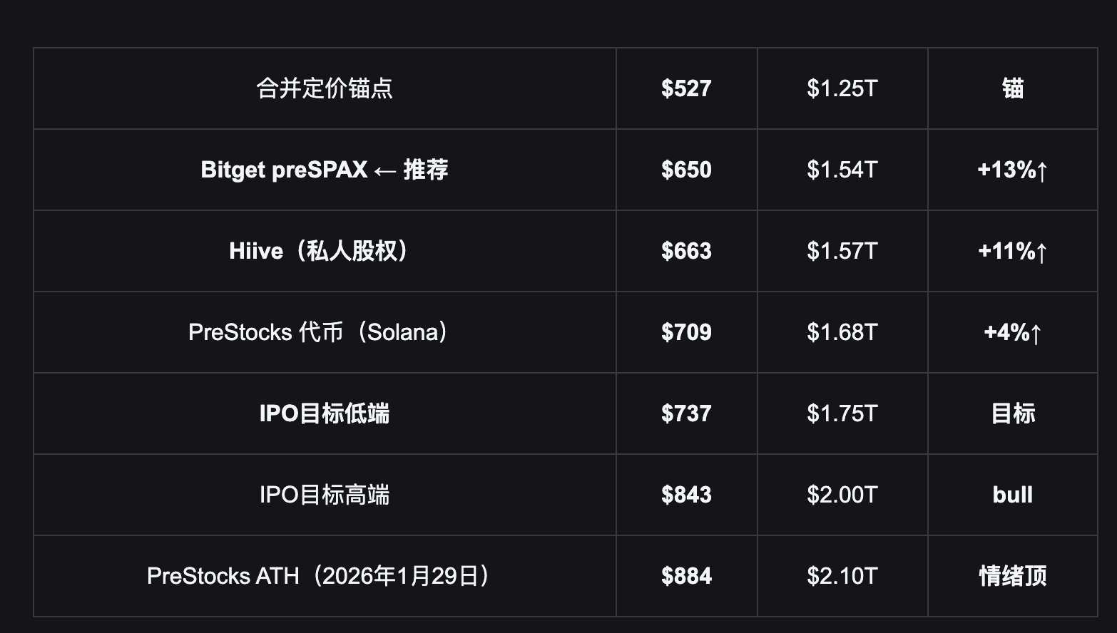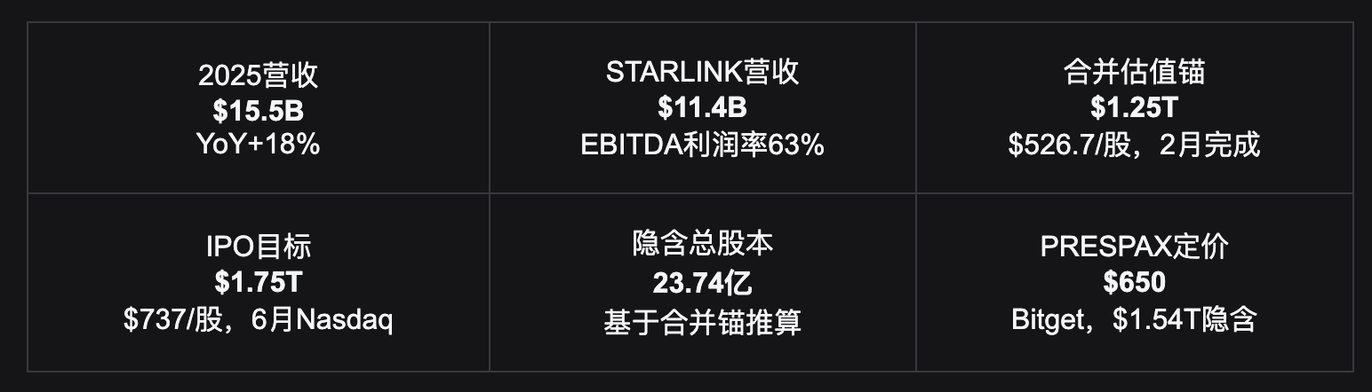 SpaceX achieved $155 billion in revenue and $80 billion in EBITDA in 2025, with Starlink currently being the most profitable global satellite network. Following the merger with xAI, the company now possesses launch capabilities, global low-orbit bandwidth, and AI inference capabilities—these three elements form a complete closed loop for the Orbital Data Center strategy. The $1.75 trillion IPO target price is fundamentally supported, and the index inclusion mechanism will create sustained structural buying pressure post-listing. The most cost-effective liquid entry point currently is Bitget preSPAX, priced at $650, implying a valuation of $1.54 trillion, which is lower than all comparable benchmarks.