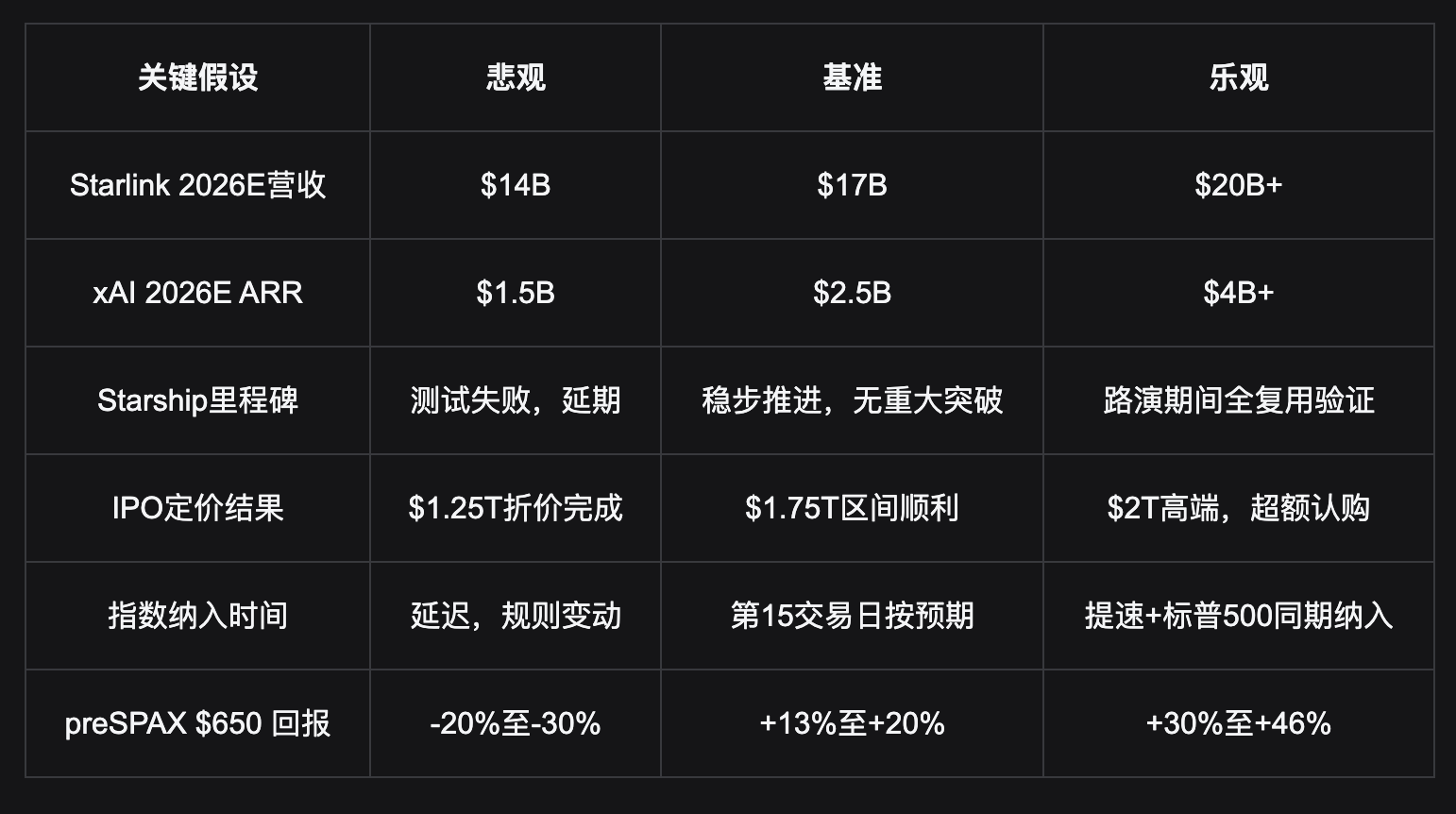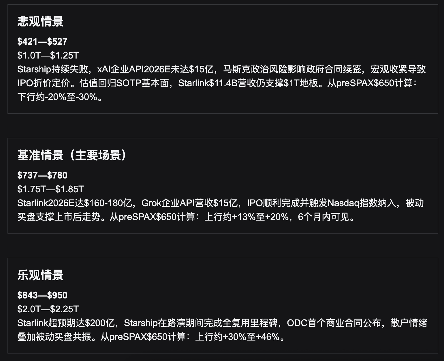 Main downside risks: ① Major Starship accident (highest probability impact); ② Deteriorating relationship between Musk and Trump affecting government contracts; ③ Nasdaq index rule amendments challenged at the congressional level; ④ Sharp macro tightening leading to a shutdown of the overall IPO market. The probability of any single risk occurring is relatively limited, but the impact is significant when they occur in combination.