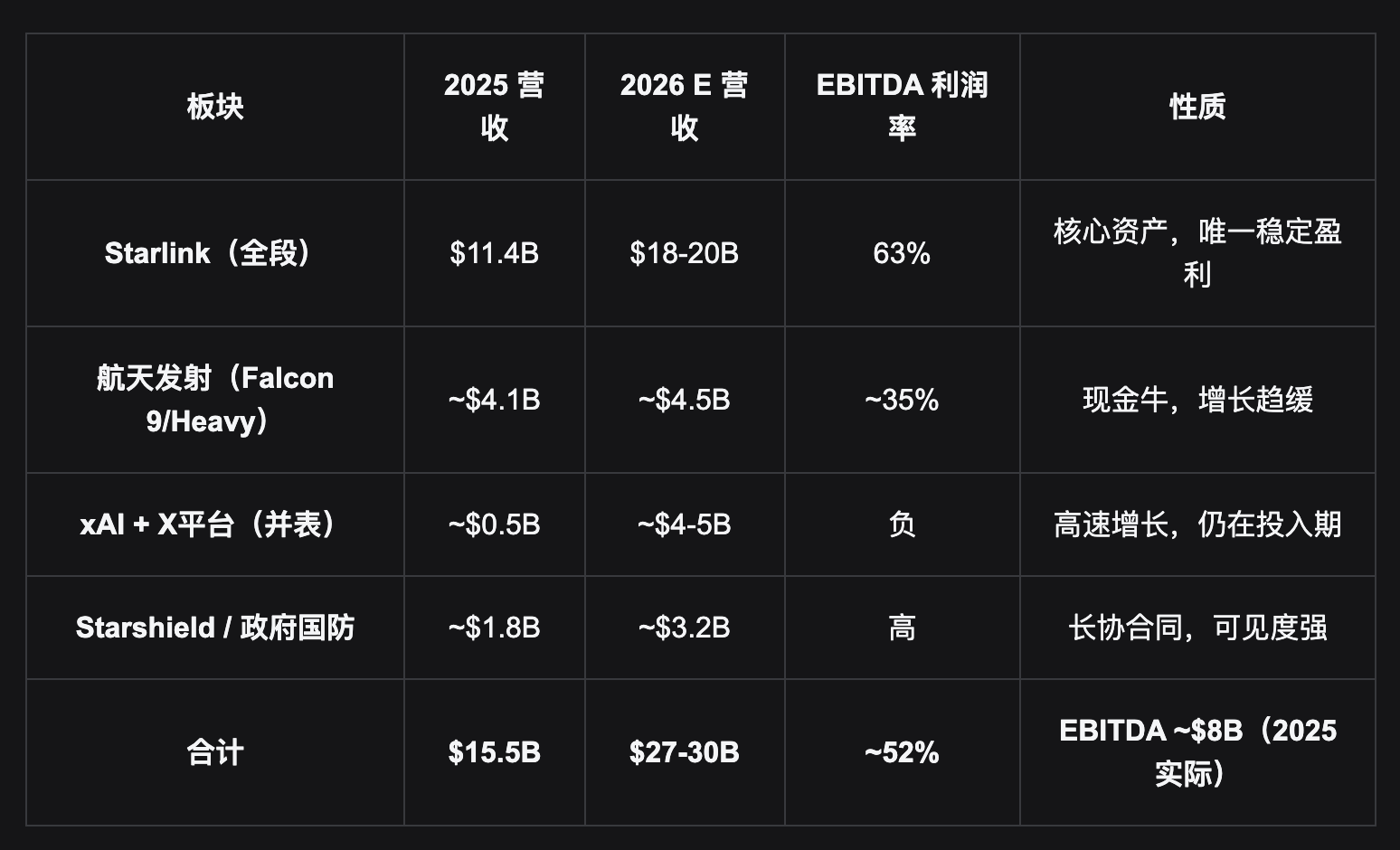 Starlink is the current core asset. With $11.4 billion in revenue and a 63% EBITDA margin in 2025, it is the only business unit that can independently support the company's valuation. Users grew from 4.5M at the beginning of the year to over 9M by year-end, surpassing 10M in February 2026. The revenue structure consists of three tiers: consumer broadband ($120/month), enterprise/maritime/aviation ($5,000+/month), and government/defense (Starshield, long-term contracts). Quilty Space forecasts Starlink's full-year revenue to reach $20 billion in 2026, with EBITDA around $14 billion. This forecast is based on the scaling of D2C (direct-to-cellphone) and continued enterprise penetration, not an aggressive assumption.