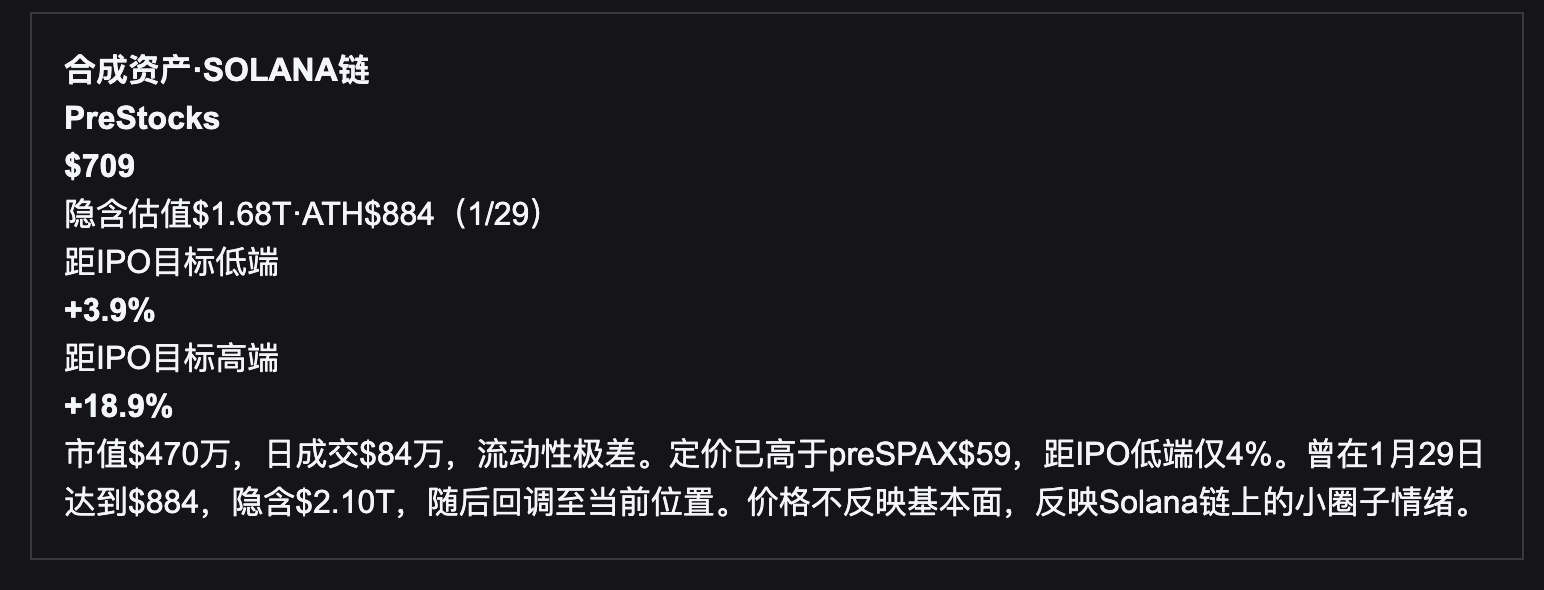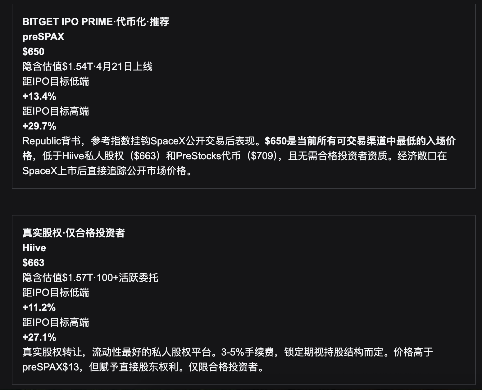 Pricing Conclusion: preSPAX at $650 is the only option among the three channels that simultaneously satisfies "lowest pricing" and "acceptable liquidity." Compared to Hiive: $13 cheaper (-2%), no accredited investor requirement. Compared to PreStocks: $59 cheaper (-8.3%), offering 9.5 percentage points more upside potential, with more reliable liquidity (Republic backing vs. Solana chain native token). Post-IPO, preSPAX settlement references SpaceX's public market price, providing a clear economic return path.