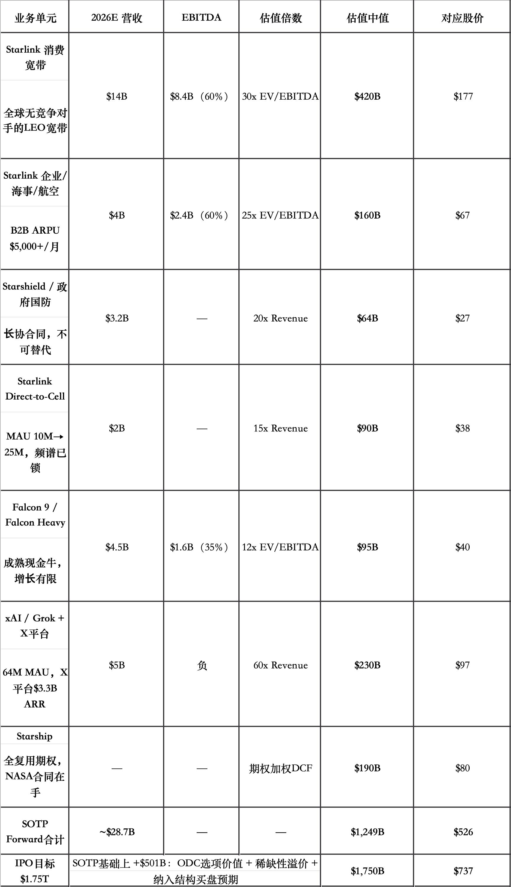 $1.75T corresponds to $737/share, a 40% premium over the merger anchor of $527. The following SOTP valuation is based on 2026 expected financial data for forward-looking valuation, aiming to assess whether the IPO pricing is within a reasonable range, not to reiterate the historical merger anchor.