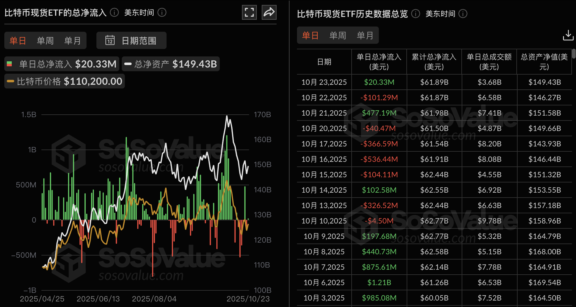 Odaily星球日报讯 根据 SoSoValue 数据,昨日(美东时间 10 月 23 日)比特币现货 ETF 总净流入 2032.54 万美元。
