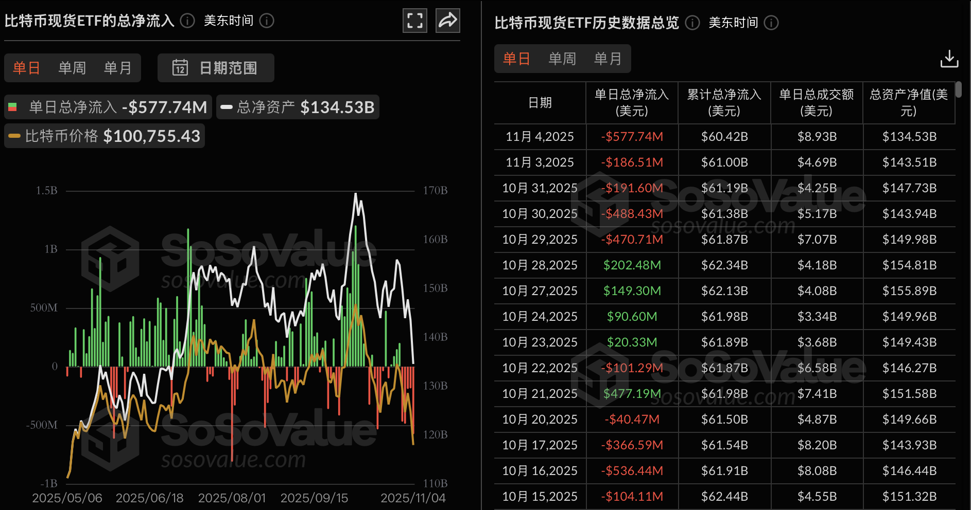 Odaily星球日报讯 根据 SoSoValue 数据,昨日(美东时间 11 月 4 日)比特币现货 ETF 总净流出 5.78 亿美元。