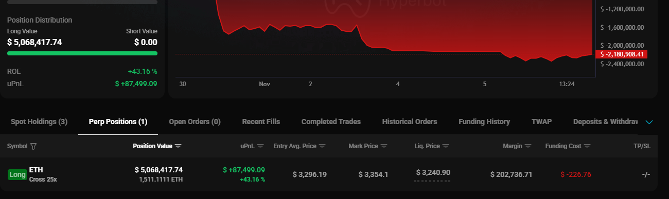 Odaily星球日报讯 据链上数据监测, “麻吉大哥 ”黄立成的 25 倍杠杆 ETH 多单头寸已加仓至 1,511.1111 ETH,持仓价值约 506.9 万美元,清算价 3,240.90 美元。