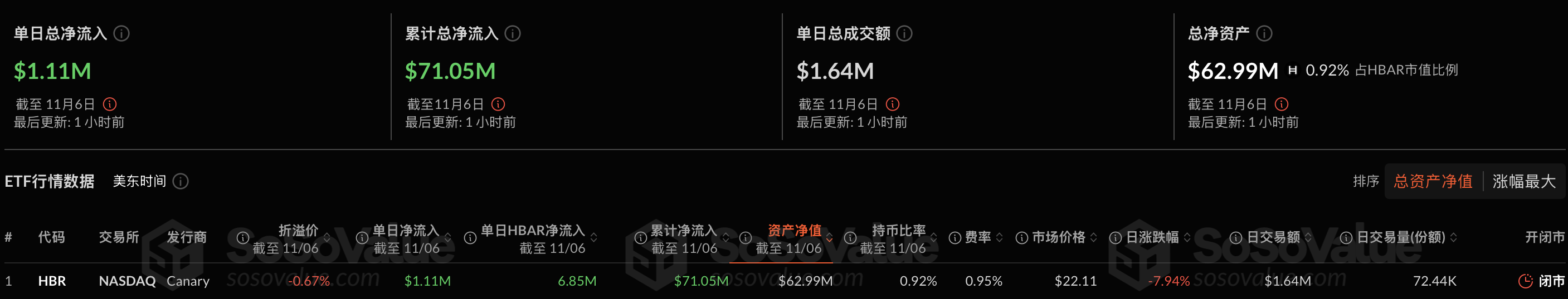 Odaily星球日报讯 根据 SoSoValue 数据,美东时间 11 月 6 日 Canary HBAR 现货 ETF HBR 净流入 111 万美元。截至发稿前,Canary HBAR ETF 总资产净值为 6299 万美元,HBAR 净资产比率(市值较HBAR总市值占比)达 0.92%。