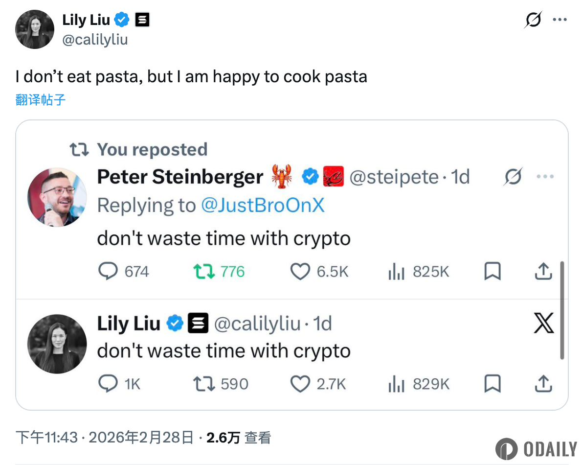 Odaily星球日报讯 Solana 基金会总裁 Lily Liu 于 X 贴出了其此前关于“不要在加密货币上浪费时间”的争议言论截图,并配文表示:“我不吃意大利面,但我很乐意做意大利面。”