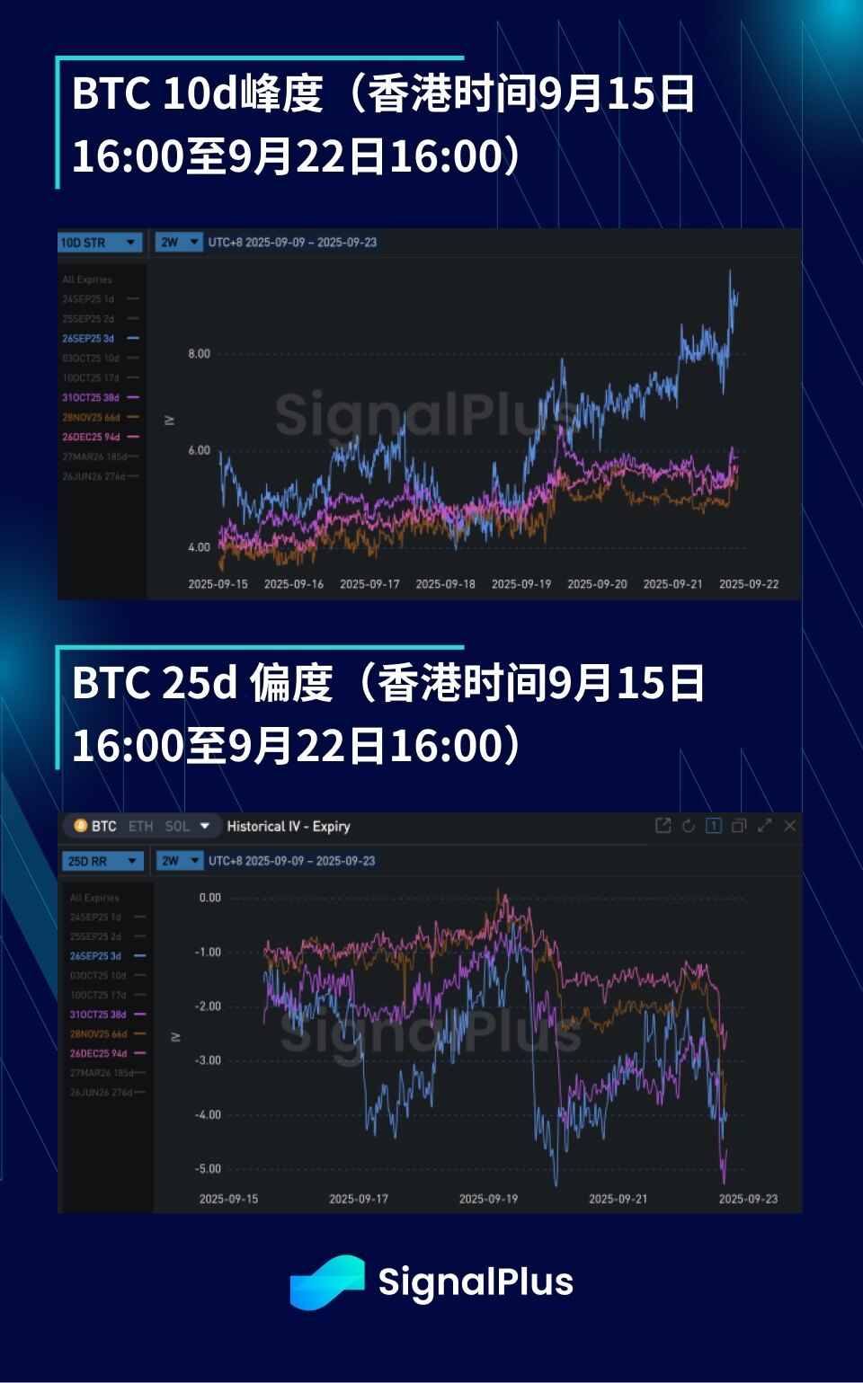 - 上周实际波动率继续维持在 20%中低段水平。ETF 流入和国库资产购买(如 MSTR)为币价提供了支撑,但每次上涨时仍有大量卖盘压制,暂时限制了上行方向的实际波动率。局部 Gamma 表现不佳导致本周每日波动率定价在 22–25 个波动率点左右;在 FOMC 会议前出现了哄抬,将隔夜波动率推高至 60 个点,定价 2.4%的波动预期,但该波动幅度最终并未实现。