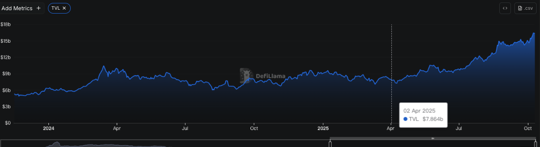 同时 DeFiLlama 数据 显示,BNB Chain TVL 一直稳步增长。2025 年 4 月 BNB Chain TVL 约 80 亿美元,短短半年时间,其 TVL 已达 163.8 亿美元,增长率超 100%。TVL 增长不仅反映出投资者对于 BNB Chain 的信赖,而且也意味着 BNB Chain 生态逐渐繁荣,为投资者带来了更多投资机会。