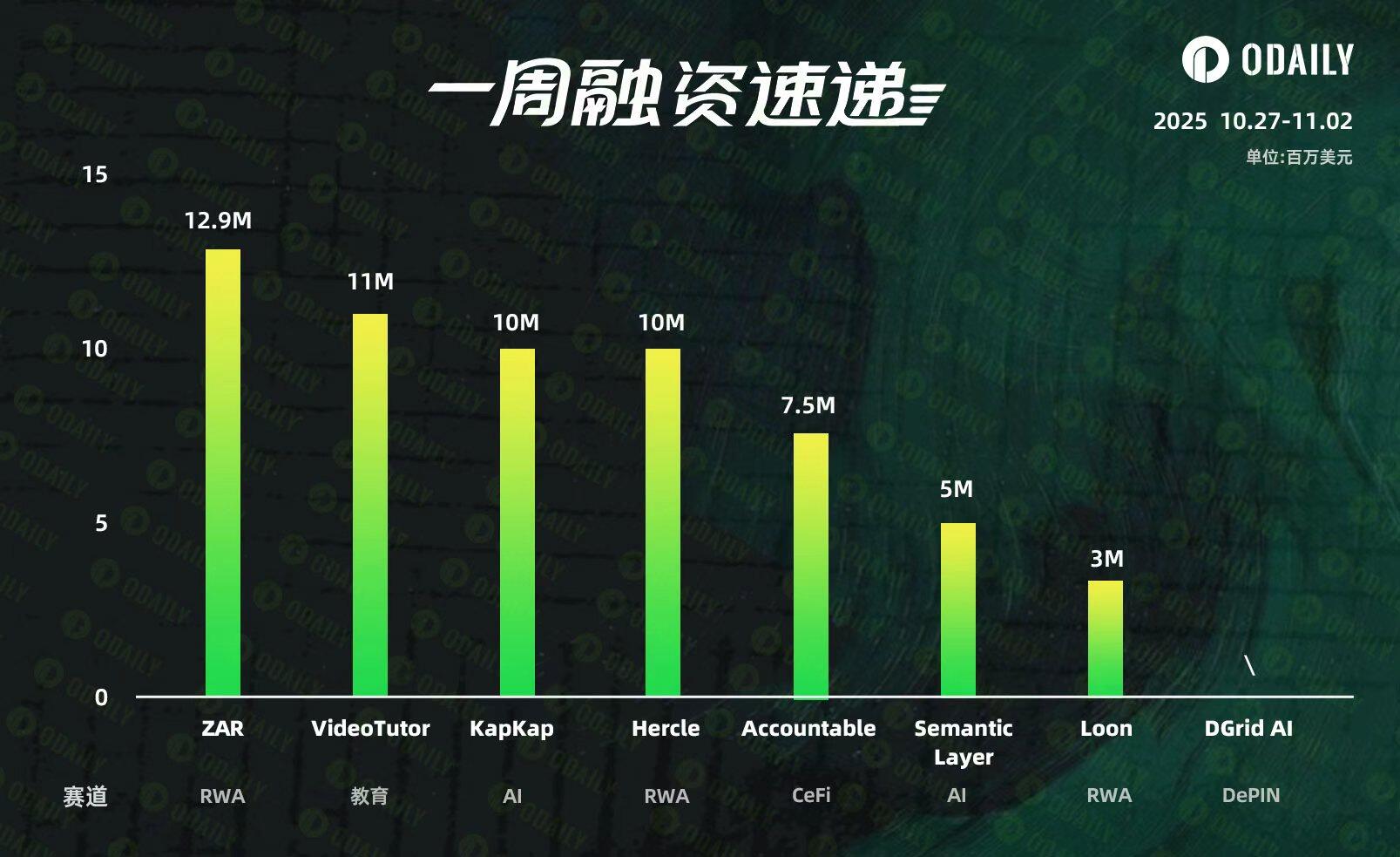 根据 Odaily 星球日报不完全统计,2025 年 10 月 27 日至 11 月 2 日,全球区块链领域共披露 8 起融资事件,较前一周的 16 起大幅减少。融资总额仅为 5940 万美元,较前一周的 1.81 亿美元大幅下滑。
