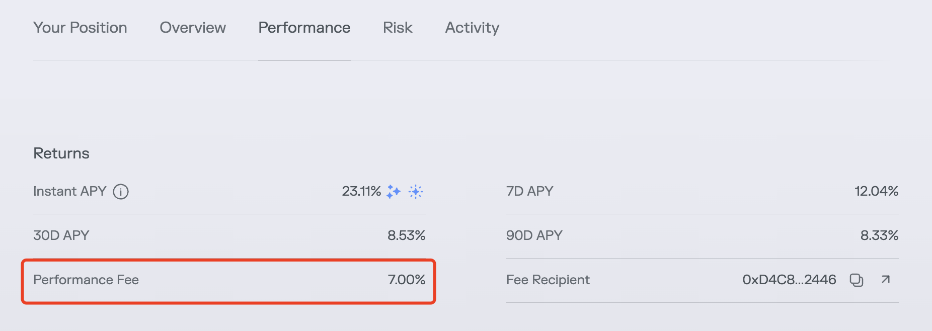 在现实情况下,业绩分成是最常见的 Curator 收入来源。如下图所示,Morpho 在以太坊主网上由 MEV Capital 负责的 USDC 资金池会收取 7% 的绩效分成。
