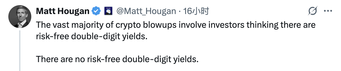 最重要的是,用户需要意识到风险总是与收益率正相关,在投出资金配置决策之前,要对最极端的情况最好思想预防 —— 可以时刻牢记 Bitwise 首席投资官 Matt Hougan 的这句话:“绝大多数加密货币的崩盘都是因为投资者误信了两位数的无风险收益率,而市场上根本不存在没有风险的两位数收益率。”