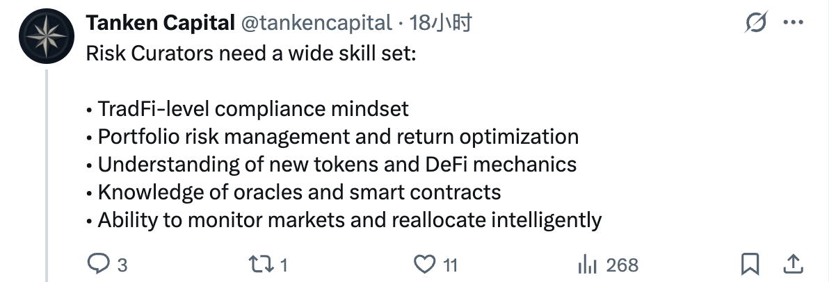 至于 Curator,则需要同时提高风险自律意识以及风险管控能力。DeFi 投研机构 Tanken Capital 就此总结了一个优秀的 Curator 在风控方面的基本要求,具体包括:
