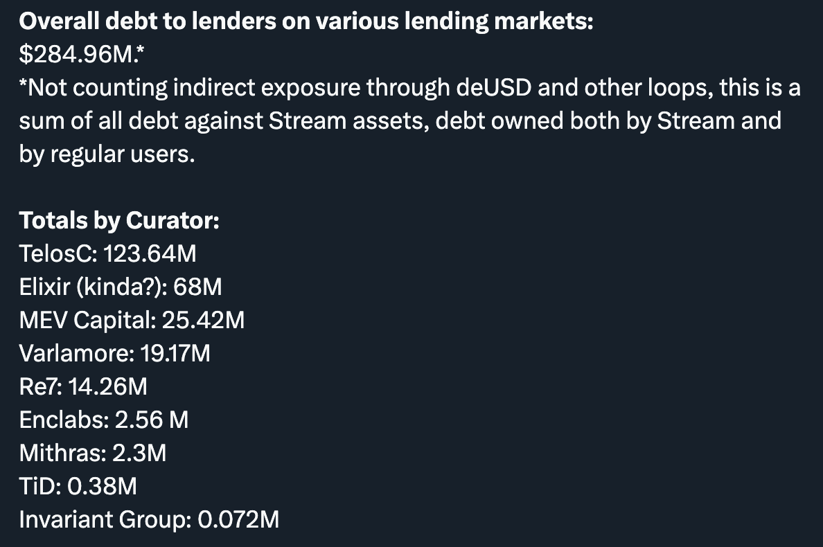 - Odaily注:图为 DeFi 社群 YAM 对 Stream Finance 事件中各大 Curator 相关债务头寸的整理。