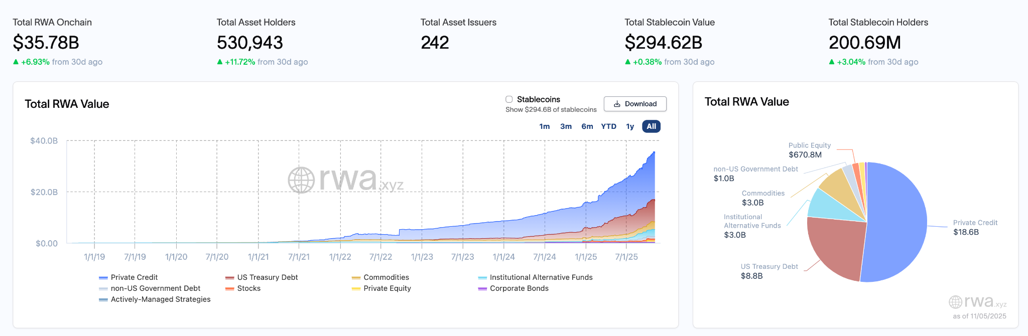 截至 2025 年 11 月 5 日,RWA 链上总价值为 357.8 亿美元,较 10 月 28 日的 350.3 亿美元增加 7.5 亿美元,涨幅为 2.14%,连续第六周实现增长,市场稳步扩张势头延续。资产持有者总数从 512,041 人上升至 530,943 人,单周新增 18,902 人,增幅为 3.69%。资产发行人数量由 230 个增加至 242 个,单周新增 12 个,是近几周以来发行人增长最快的一周。稳定币市场方面,总市值从 2959.7 亿美元微降至 2946.2 亿美元,减少 13.5 亿美元,跌幅 0.46%,变动仍在合理区间。稳定币持有者数量由 1.9877 亿人上升至 2.0069 亿人,增长约 192 万人,增幅为 0.97%。