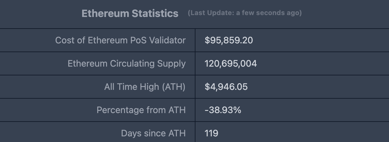 ETHUSD :现价$2,994.09,历史最高价$4,878.26,距最高价跌幅约38.93%