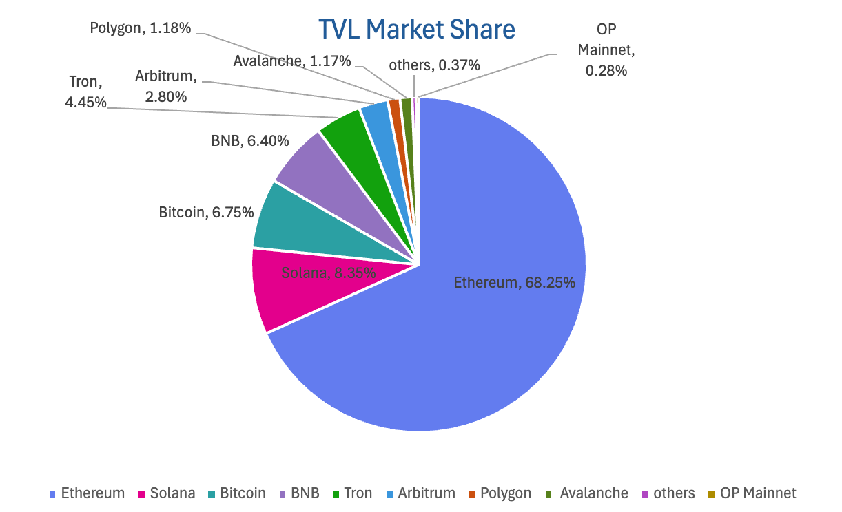 按公链进行划分,其中TVL最高的三条公链分别是Ethereum链,占比68.25%;Solana链,占比8.35%;Bitcoin,占比6.75%。