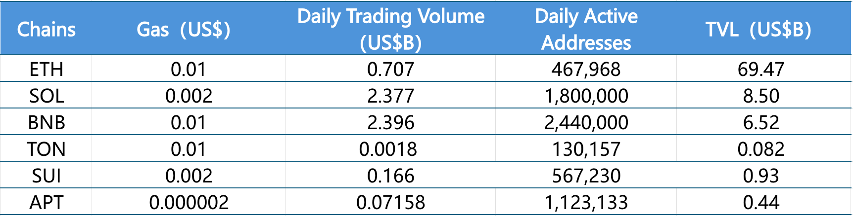主要从链上DEX日成交量、日活跃地址、交易费用分析目前主要Layer1含ETH、SOL、BNB、TON、SUI以及APTOS的相关数据。