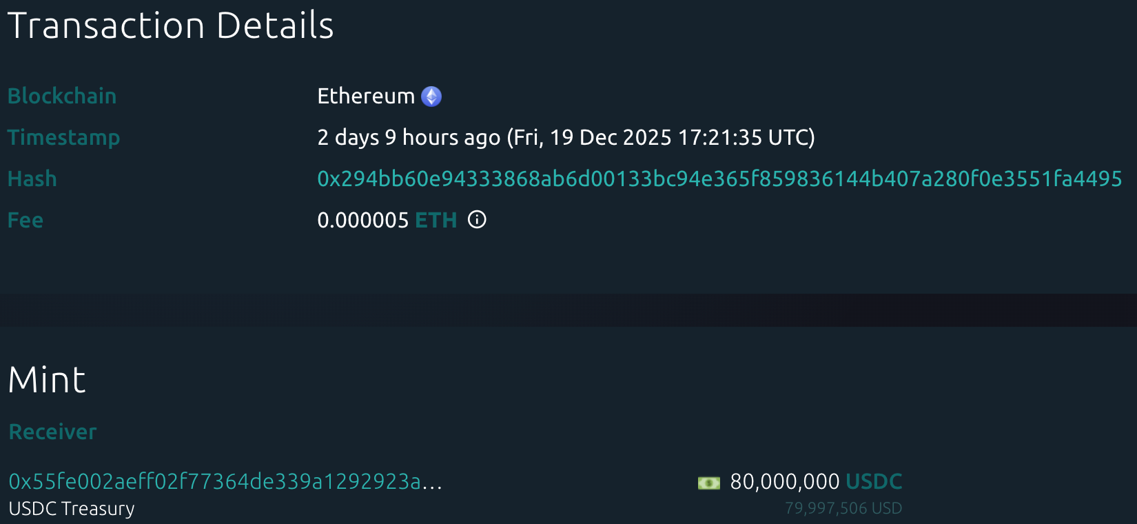 据Whale Alert数据显示,本周USDC Treasury总计增发10.07亿枚USDC,Tether Treasury本周总计无增发USDT。本周稳定币增发总量为10.07亿枚,较上周稳定币增发总量(36.67亿枚)下降72.53%。