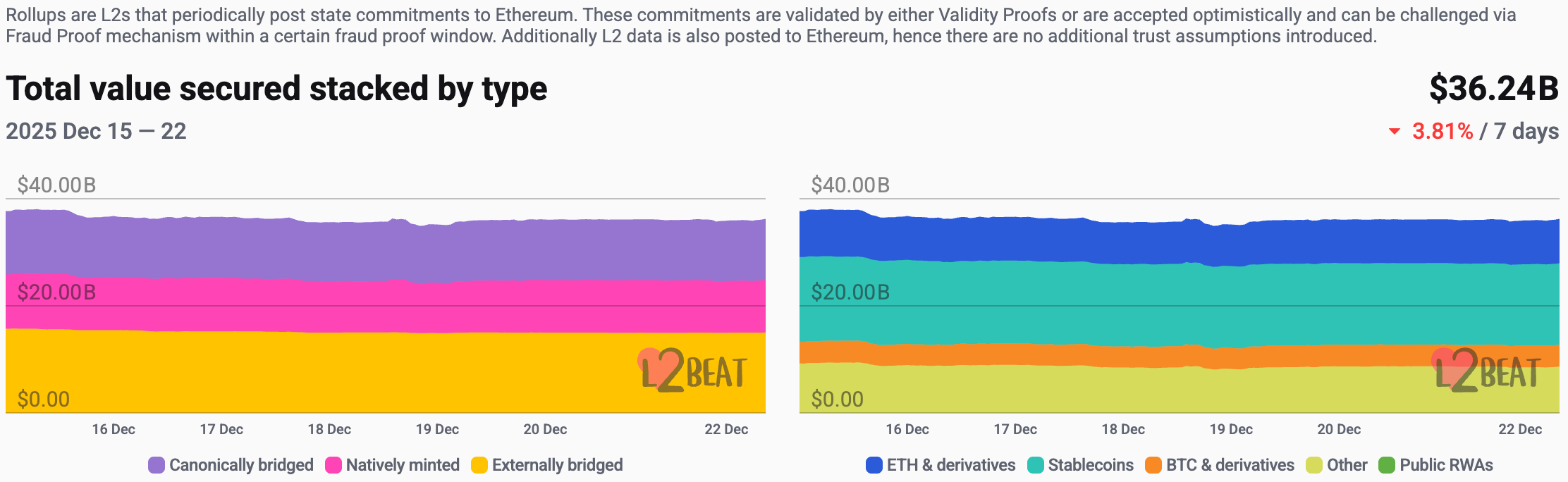 据L2Beat数据显示,以太坊 Layer 2总TVL为$362.4亿,本周较上周($376.5亿)整体跌幅为3.74%。