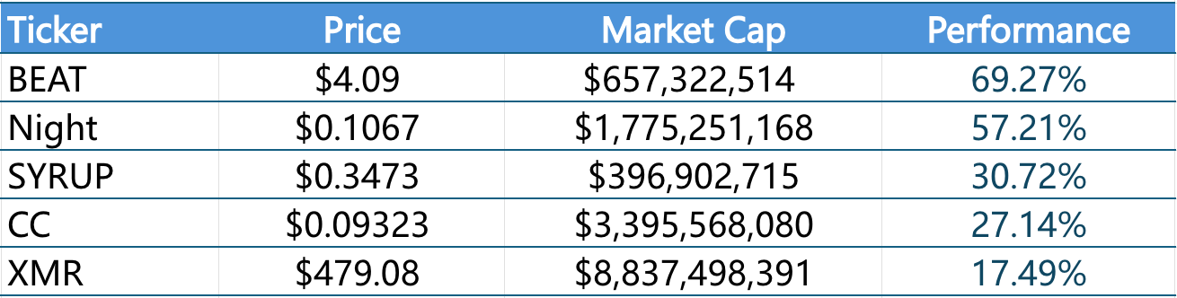 1.本周涨幅前五的VC币和Meme币