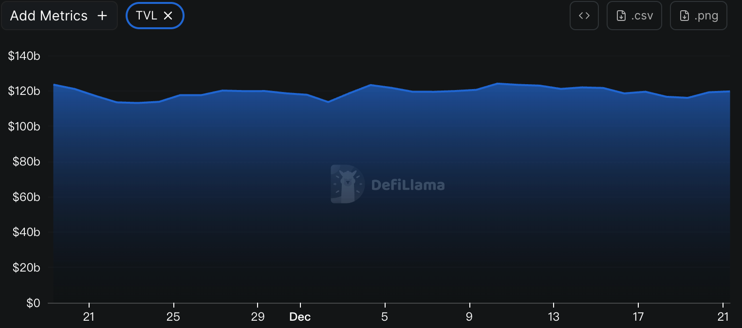 据DeFiLlama的数据,本周DeFi总TVL为$1,196亿,较上周1,214亿,下降约1.48%。